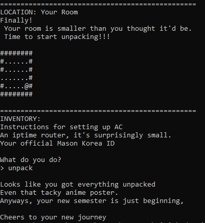 A small adventure game where you move throughout rooms to pick up items that will reveal the end goal.