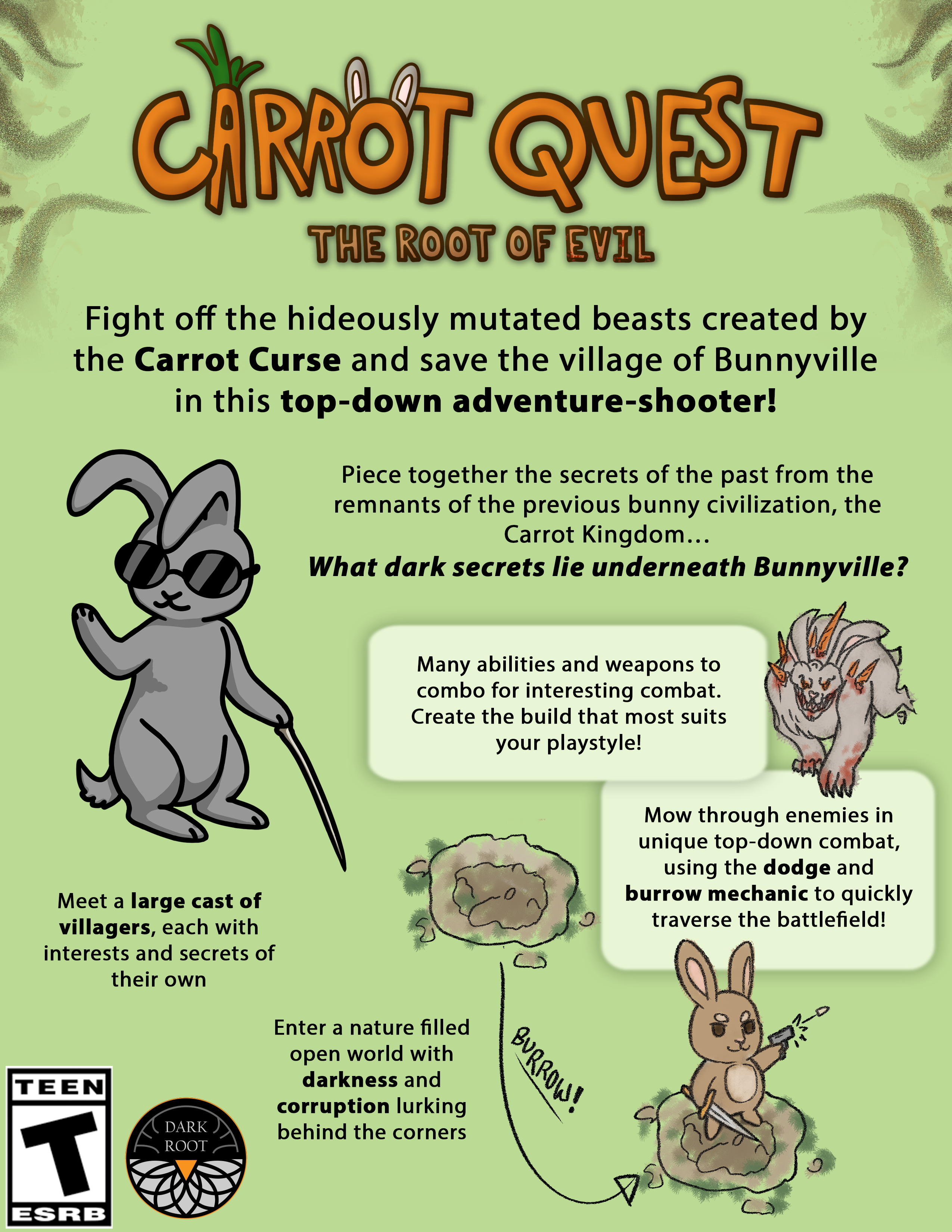 Carrot Quest is a 2D bullet hell run and gun game where players explore Bunnyville to stop an evil curse from taking over the land.