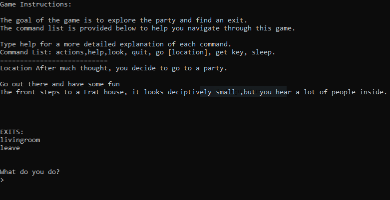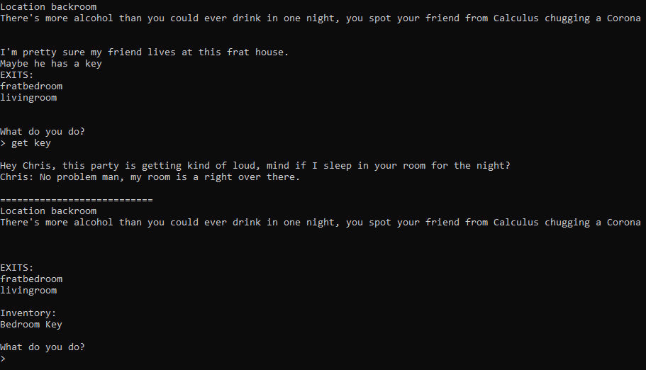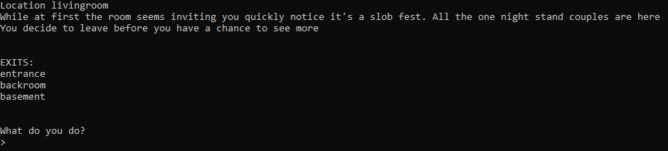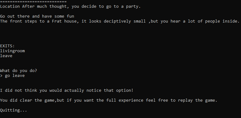 As part of my game programming course, we were tasked with creating a simple text adventure with a win condition being set by performing an action. There are two endings in the game, enjoy! : D A link to the game can be found below.